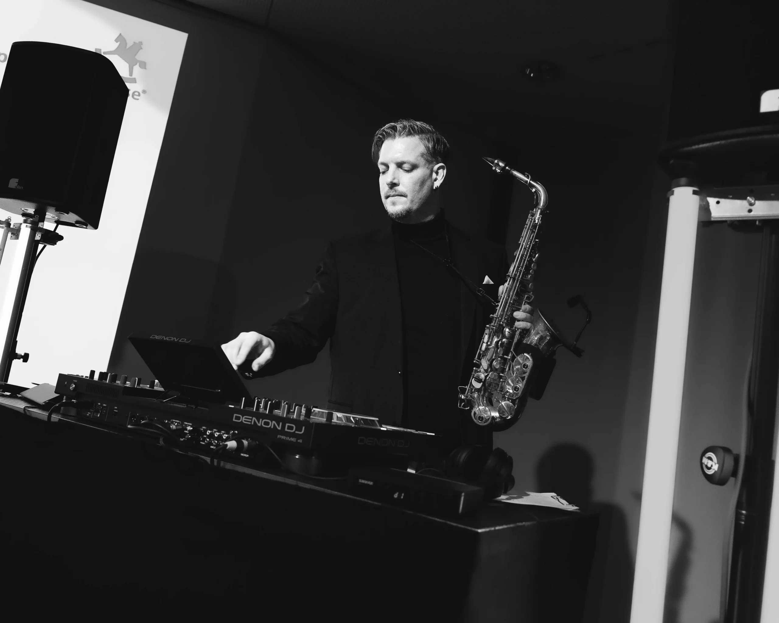 Schnell kombinierte er beide Leidenschaften, DJ und Saxophon, und spezialisierte sich auf Privat- und Firmenveranstaltungen. Chilig zu Ibiza-Vibes mit DJ und Saxophon in einer Person zum Sektempfang, geht es später, zur Party, mit 80s Classics zu HipHop und House. Geschickt kommt sein Saxophon zu seinen DJ Skills im Laufe des Abends immer wieder zum Einsatz.